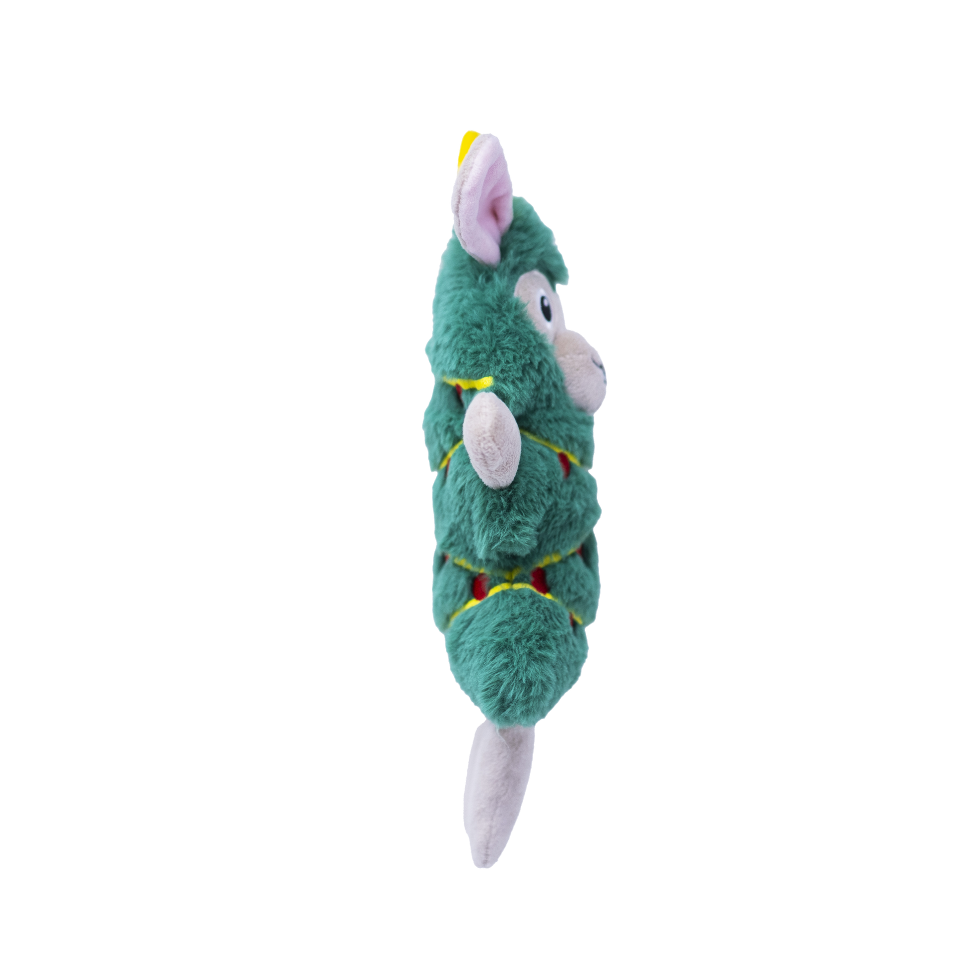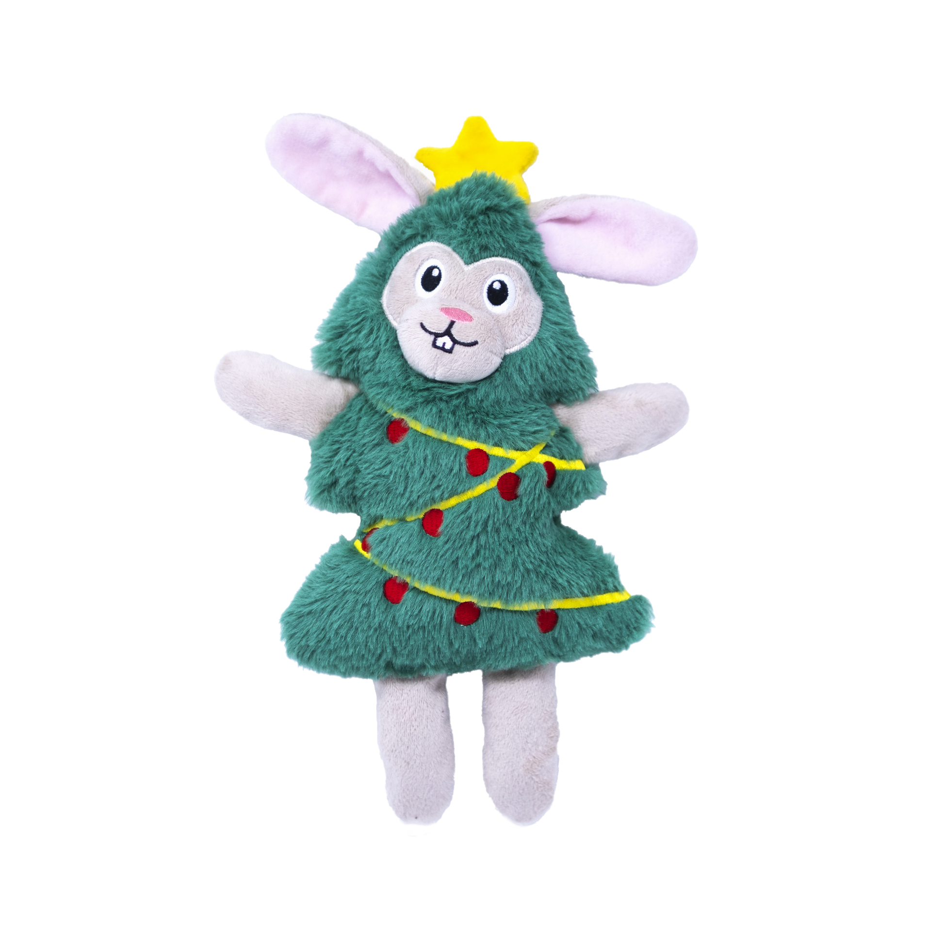 Soft Santa-themed plush toy with squeaker and polyester stuffing inside. White dog not included.